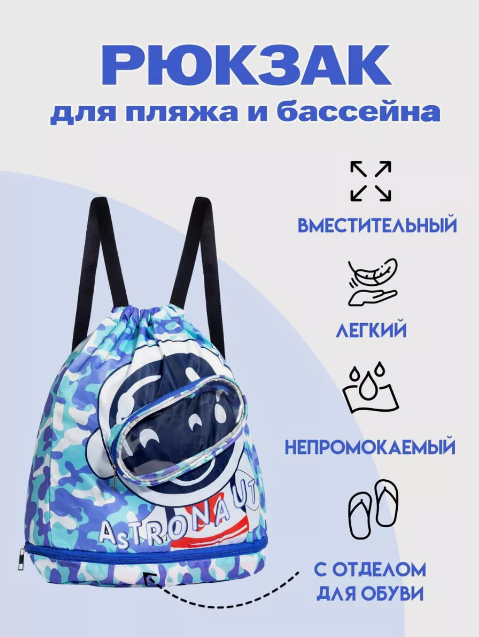 Вместительная сумка с регулируемыми ремнями и веселым принтом имеет специальное отделение для влажной одежды, компактный и легкий рюкзачок. Водонепроницаемая сумка для мокрых вещей универсальна, её можно взять в бассейн, на урок физкультуры или в путешествие.